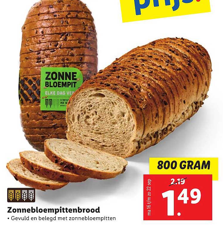 Bekijk nu de Zonnebloempittenbrood aanbieding in de Lidl folder. Deze aanbieding is geldig van 16-09-2024 tot en met 22-09-2024.