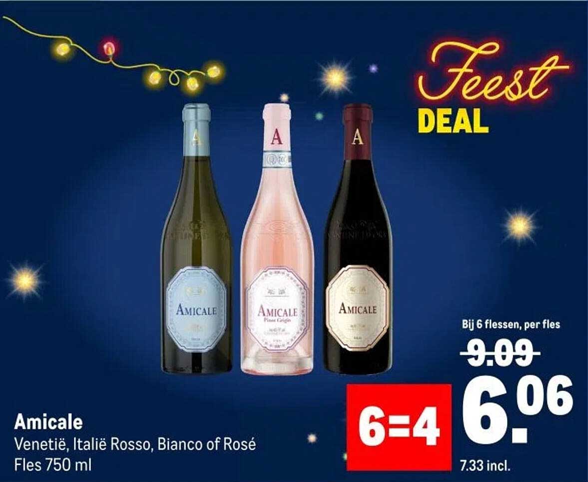 Ben je op zoek naar een heerlijke wijn voor je feestjes of gezellige avonden met vrienden? Zoek niet verder! Op deze pagina bieden we een fantastische deal voor Amicale wijnen aan. Met een keuze uit Venetië, Italië Rosso, Bianco of Rosé, is er voor ieder wat wils. Deze aanbieding is geldig van 19 november tot en met 2 december 2025 en biedt je de kans om te genieten van kwalitatieve wijnen tegen een ongeëvenaarde prijs.