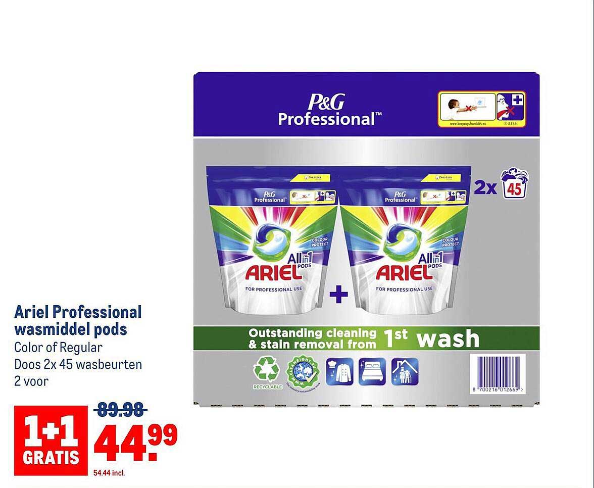 Bekijk de Ariel Professional Wasmiddel Pods aanbieding bij Makro! Deze fantastische aanbieding is nu beschikbaar in de nieuwste Makro folder. Profiteer van deze kans en bespaar flink op je aankoop.