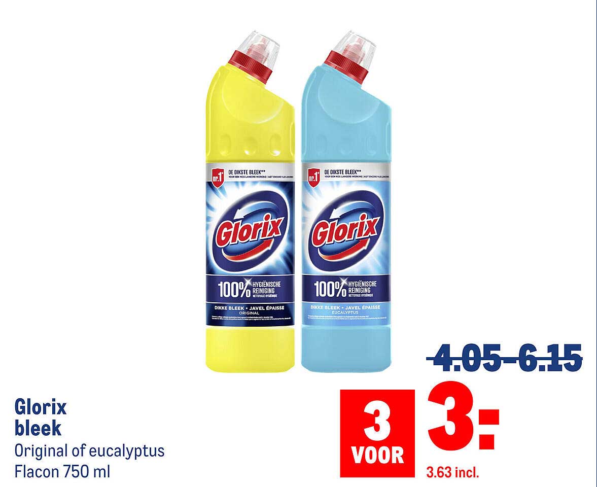 Bekijk nu de Glorix bleek Original of eucalyptus Flacon 750 ml aanbieding in de Makro folder. Deze aanbieding is geldig van 09-04-2025 tot en met 22-04-2025.
