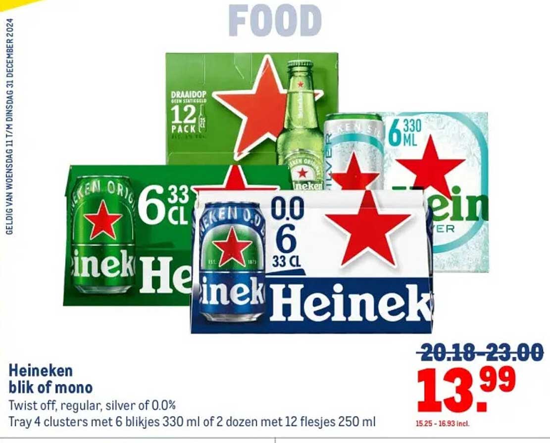 Bekijk nu de Heineken blik of mono aanbieding in de Makro folder. Deze aanbieding is geldig van 11-12-2024 tot en met 31-12-2024.