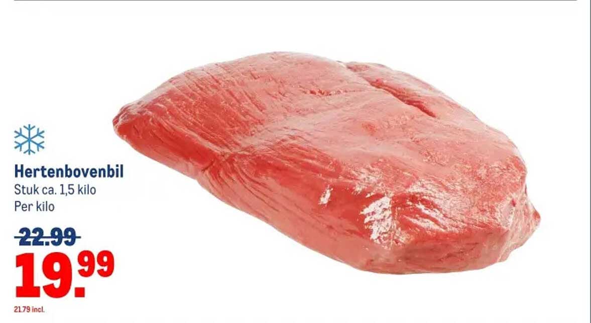 Bij Makro wordt deze hertenbovenbil aangeboden voor slechts €19,99 per kilo, in plaats van de gebruikelijke €22,99. Dit is een aanzienlijke besparing! Dit soort kwaliteitsvlees koop je niet vaak voor zo'n aantrekkelijke prijs. Het is de ideale gelegenheid om iets bijzonders te creëren zonder je budget te overschrijden.