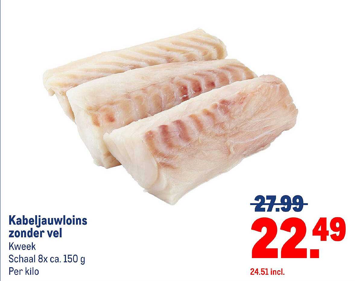 Maak je klaar om te genieten van een heerlijke maaltijd met kabeljauwloins zonder vel. Deze smakelijke en malse vis is ideaal voor verschillende gerechten en biedt een uitstekende bron van eiwitten. Of je nu een snelle doordeweekse maaltijd wilt creëren of een feestelijke dis, deze kabeljauwloins passen perfect bij elke gelegenheid. Profiteer van deze aanbieding om je keuken te voorzien van een premium product tegen een aantrekkelijke prijs.