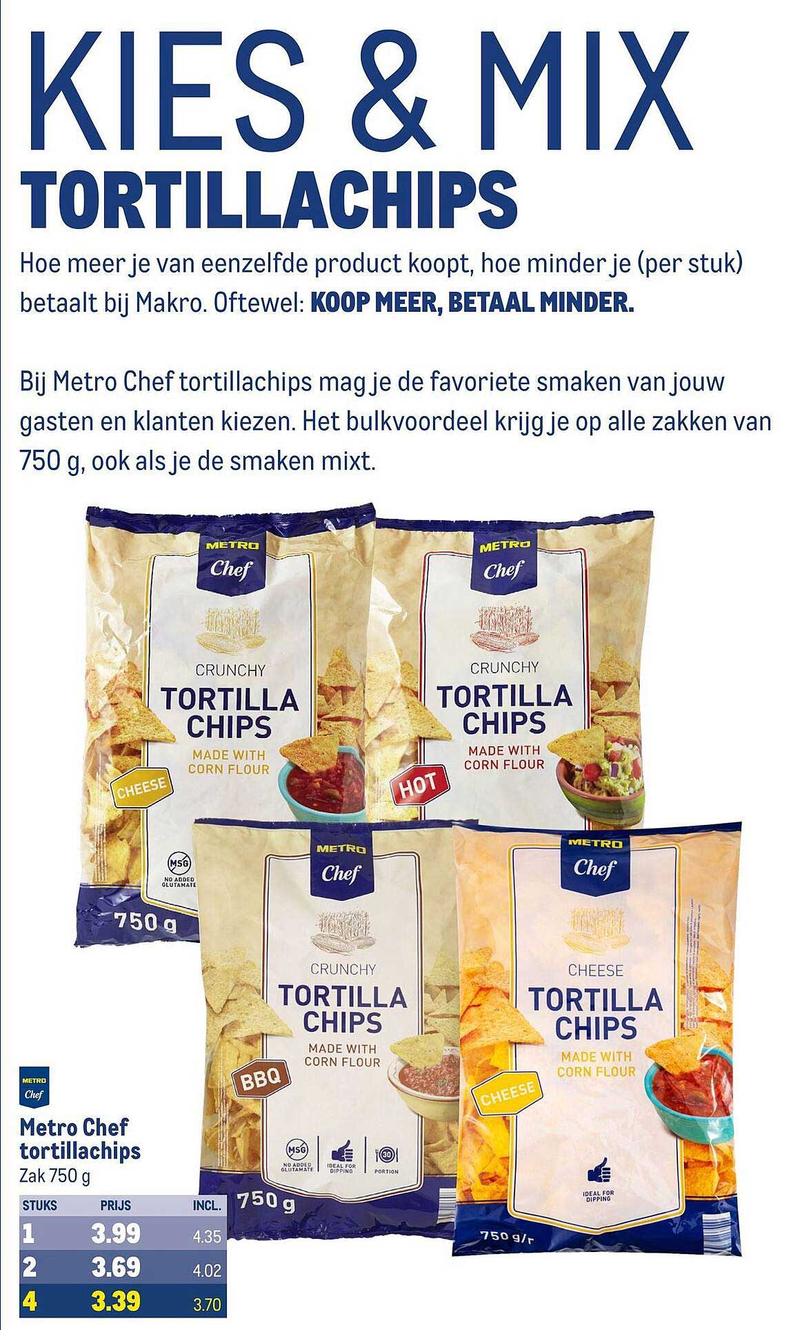 Bekijk de Kies & Mix Tortillachips aanbieding bij Makro! Deze fantastische aanbieding is nu beschikbaar in de nieuwste Makro folder. Profiteer van deze kans en bespaar flink op je aankoop.