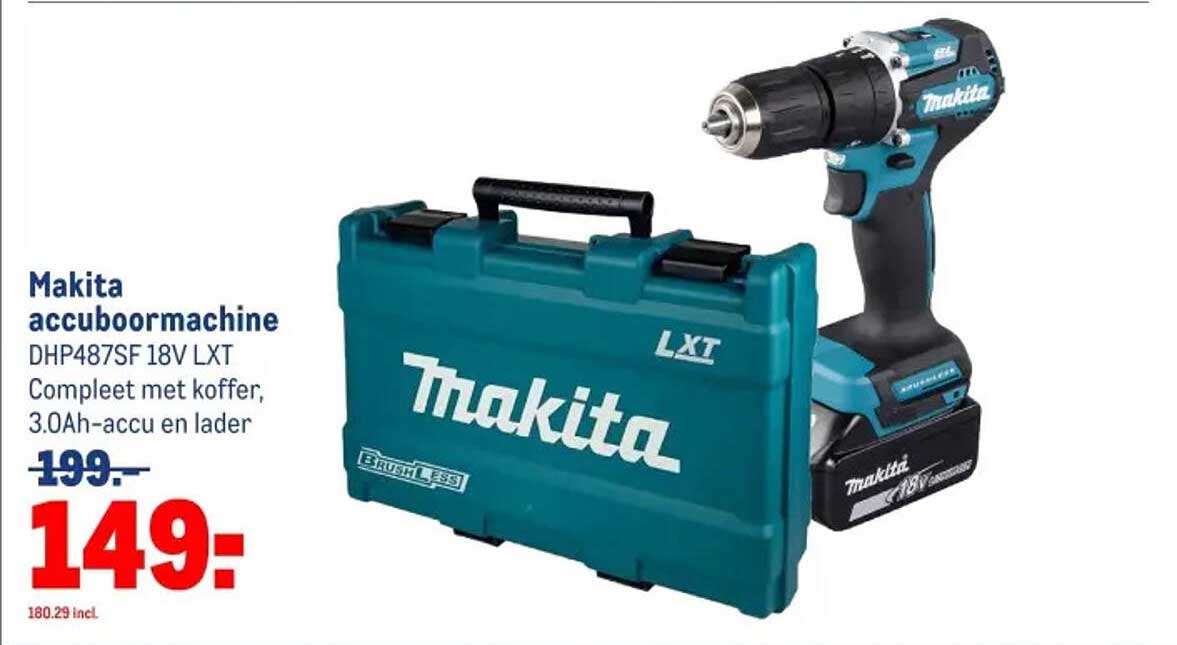 Bekijk nu de Makita accuboormachine DHP487SF 18V LXT Compleet met koffer, 3.0Ah-accu en lader aanbieding in de Makro folder. Deze aanbieding is geldig van 09-04-2025 tot en met 22-04-2025.
