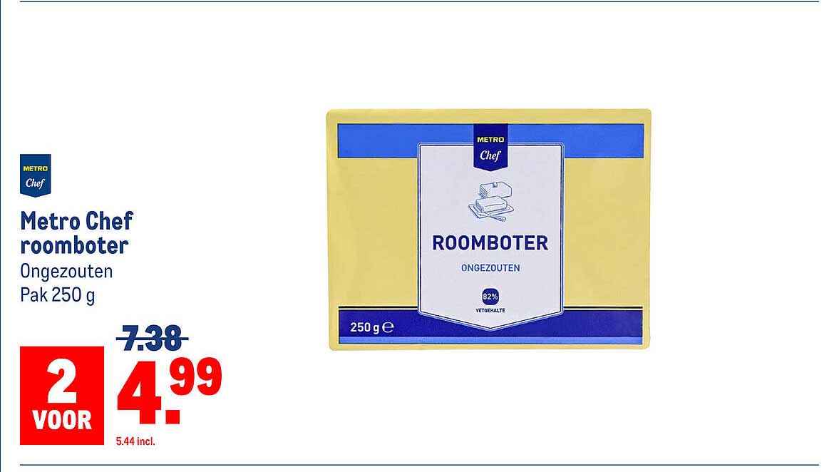 Bekijk nu de Metro Chef roomboter Ongezouten Pak 250 g aanbieding in de Makro folder. Deze aanbieding is geldig van 09-04-2025 tot en met 22-04-2025.