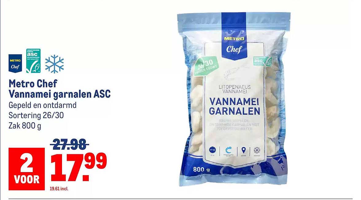 Bekijk de Metro Chef Vannamei Garnalen Asc aanbieding bij Makro! Deze fantastische aanbieding is nu beschikbaar in de nieuwste Makro folder. Profiteer van deze kans en bespaar flink op je aankoop.
