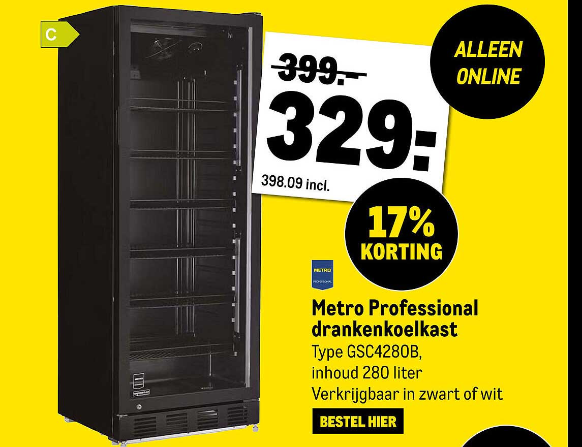 Normaal gesproken kost de Metro Professional drankenkoelkast €399,-, maar nu koop je het voor slechts €329,-. Dat is 17% korting! Dit is een geweldige kans om te investeren in kwaliteit, terwijl je ook je budget in de gaten houdt. De prijs is inclusief BTW, wat het nog aantrekkelijker maakt.
