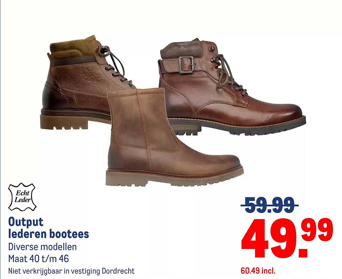 Bekijk de Output Leren Bootees aanbieding bij Makro! Deze fantastische aanbieding is nu beschikbaar in de nieuwste Makro folder. Profiteer van deze kans en bespaar flink op je aankoop.