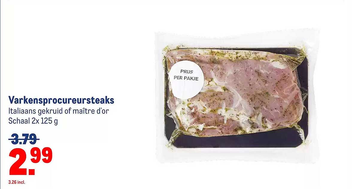 Bekijk de Varkensprocureursteaks aanbieding bij Makro! Deze fantastische aanbieding is nu beschikbaar in de nieuwste Makro folder. Profiteer van deze kans en bespaar flink op je aankoop.
