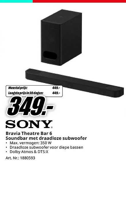 Als je op zoek bent naar de perfecte upgrade voor je home entertainment systeem, dan is deze aanbieding een echte kans! De Sony Bravia Theatre Bar 6 met draadloze subwoofer koppelt een modern design aan krachtige prestaties. Met een prijs van slechts €349,00, van de reguliere prijs van €449,00, is dit een aanbod dat je niet wilt missen. Deze soundbar is ideaal voor filmavonden of muziekplezier, en zal je kijkervaring naar een hoger niveau tillen.