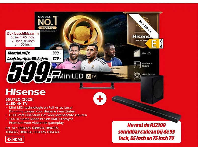 Bekijk nu de Hisense 55U72Q (2025) ULED 4K TV aanbieding in de MediaMarkt folder. Deze aanbieding is geldig van 07-11-2025 tot en met 01-12-2025.