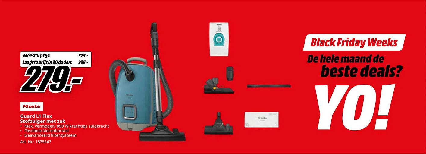 Bekijk nu de Miele Guard L1 Flex Stofzuiger met zak aanbieding in de MediaMarkt folder. Deze aanbieding is geldig van 07-11-2025 tot en met 01-12-2025.
