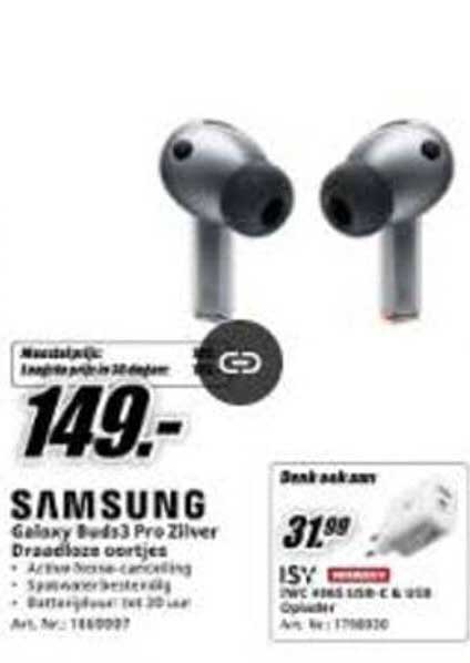 Ben je op zoek naar de perfecte draadloze oortjes? Dan is deze aanbieding van de SAMSUNG Galaxy Buds3 Pro Zilver iets voor jou! Deze oortjes zijn niet alleen stijlvol, maar bieden ook een ongeëvenaarde geluidskwaliteit. Je kunt ze nu in de MediaMarkt-folder vinden van 4 augustus 2025 tot en met 10 augustus 2025. Wees er snel bij, want zulke deals zijn vaak snel weg!
