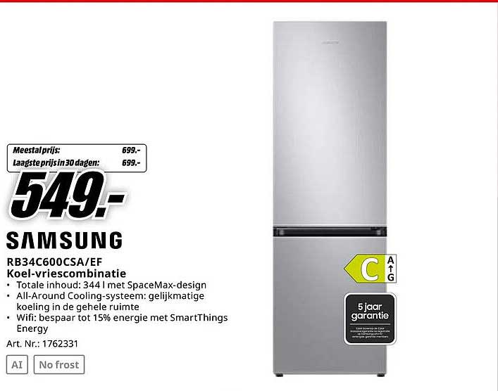 Bekijk nu de Samsung RB34C600CSA/EF Koel-vriescombinatie aanbieding in de MediaMarkt folder. Deze aanbieding is geldig van 07-11-2025 tot en met 01-12-2025.