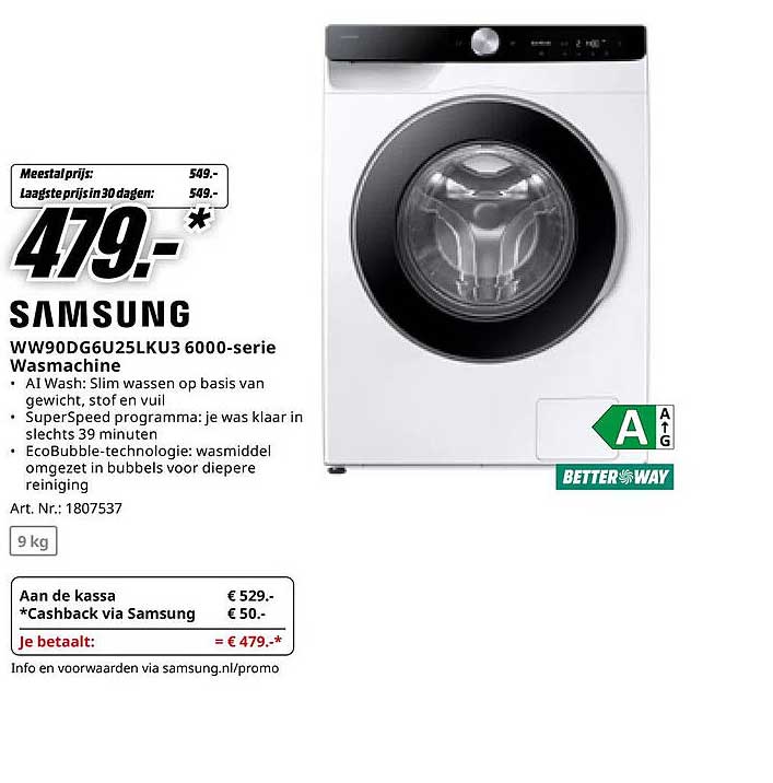 Bekijk nu de Samsung WW90D6G6U25LKU3 6000-serie Wasmachine aanbieding in de MediaMarkt folder. Deze aanbieding is geldig van 07-11-2025 tot en met 01-12-2025.