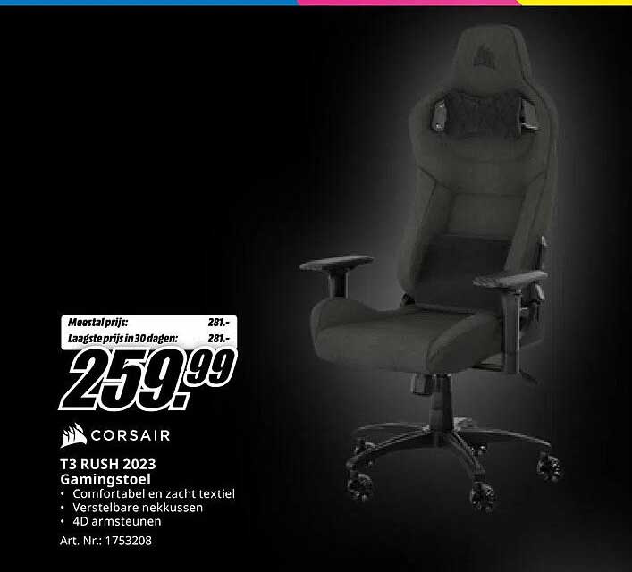 Bekijk nu de T3 RUSH 2023 Gamingstoel aanbieding in de MediaMarkt folder. Deze aanbieding is geldig van 07-11-2025 tot en met 01-12-2025.