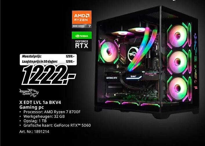 Bekijk nu de X EDT LVL 1a BKV4 Gaming pc aanbieding in de MediaMarkt folder. Deze aanbieding is geldig van 07-11-2025 tot en met 01-12-2025.