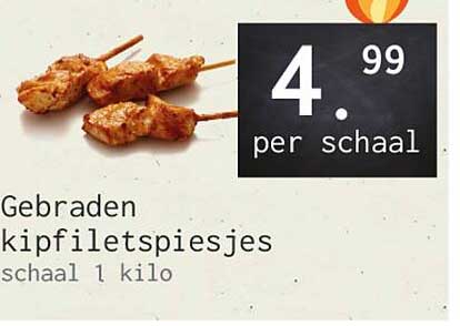 De gebraden kipfiletspiesjes zijn nu verkrijgbaar voor maar €4,99 per schaal. Dit is een aantrekkelijke prijs, zeker als je het vergelijkt met de normale prijzen in de supermarkt. Met deze aanbieding maak je niet alleen je smaakpapillen gelukkig, maar houd je ook je portemonnee tevreden!