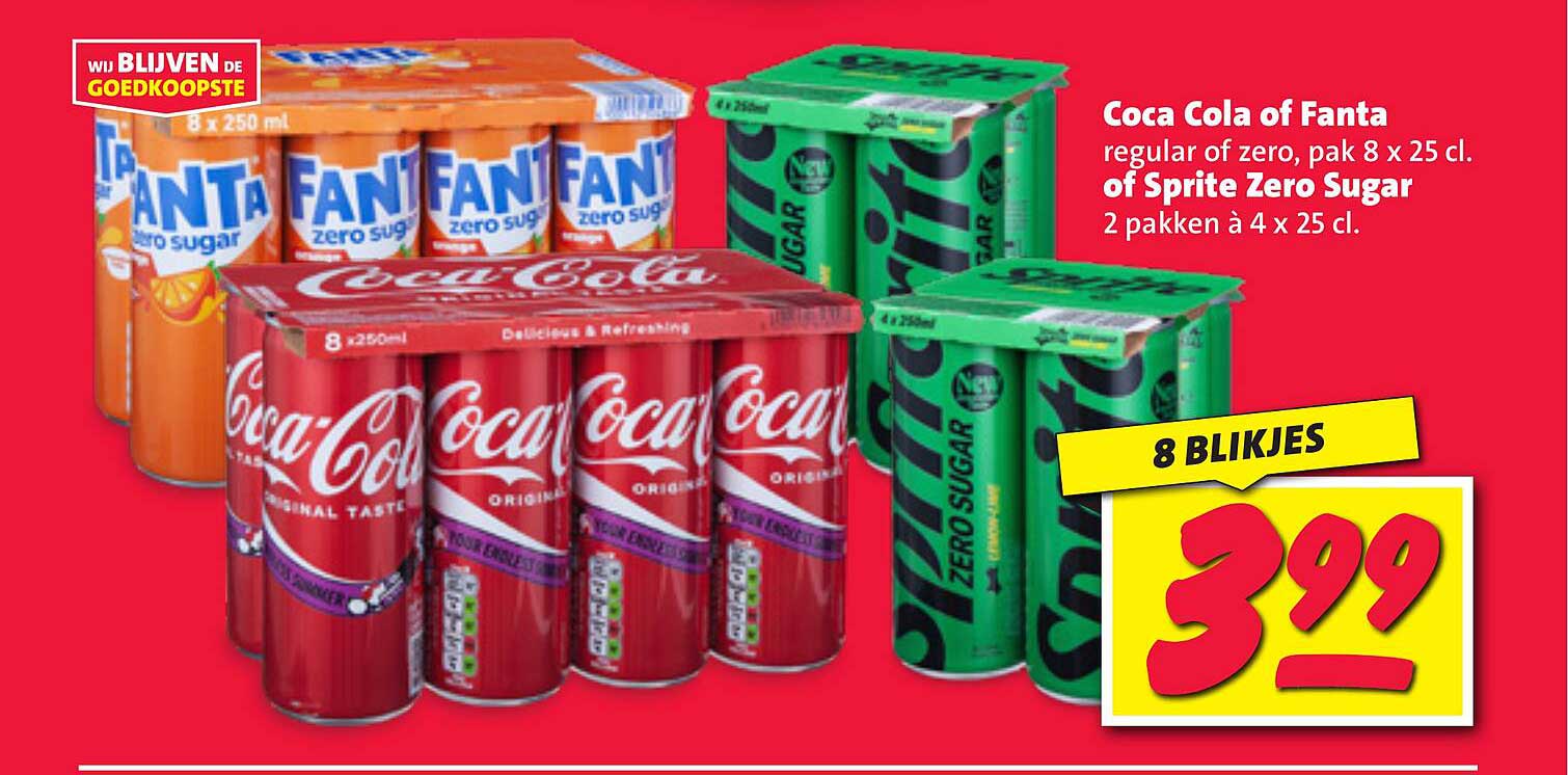 Bekijk nu de Coca Cola of Fanta regular of zero, pak 8 x 25 cl. of Sprite Zero Sugar aanbieding in de Nettorama folder. Deze aanbieding is geldig van 16-09-2024 tot en met 21-09-2024.
