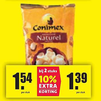De reguliere prijs voor de Conimex Naturel is €1,54 per stuk, maar bij aankoop van 2 stuks krijg je 10% extra korting! Dit betekent dat je de prijs kunt verlagen naar slechts €1,39 per stuk. Een uitstekende deal voor zo'n smakelijk product! Vergelijk dit met andere snacks en je zult zien dat je met deze aanbieding flink kunt besparen.