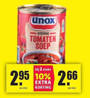 Ontdek de geweldige Unox Stevige Tomatensoep aanbieding in de nieuwste Nettorama folder. Naast deze aanbieding vind je nog veel meer aantrekkelijke kortingen. Je kunt de Unox Stevige Tomatensoep eenvoudig online bestellen via de Nettorama website of kopen in een winkel bij jou in de buurt.