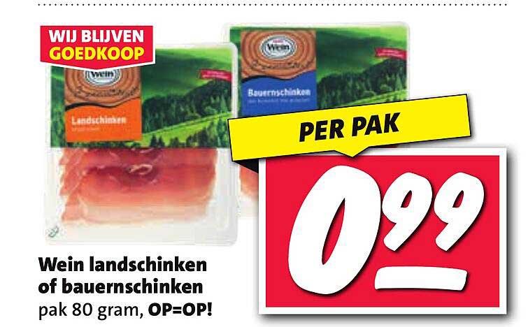 Als je op zoek bent naar een heerlijke vleeswaar voor op de boterham of als snack, dan is deze aanbieding van Wein landschinken of bauernschinken precies wat je nodig hebt! Met een aantrekkelijke prijs van slechts €0,99 per pak, is dit een perfecte gelegenheid om je voorraad aan te vullen met deze smaakvolle vleeswaren. Ze zijn ideaal voor een snelle lunch of een hapje op een feestje. Maar wees snel, want OP=OP!