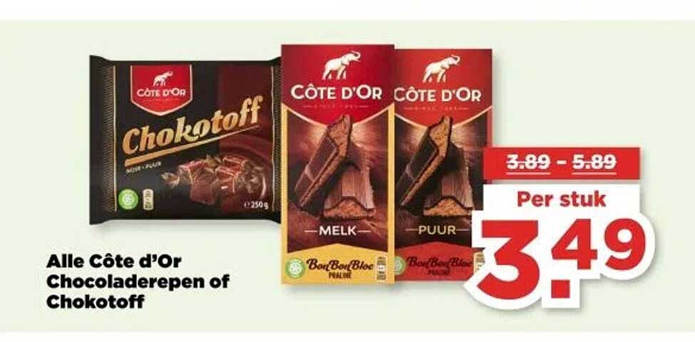 Ben je een chocoholic? Dan is deze aanbieding absoluut iets voor jou! De Côte d'Or Chocoladerepen en de onweerstaanbare Chokotoff zijn tijdelijk verkrijgbaar voor een prachtige prijs van slechts €3,49 per stuk. Of je nu houdt van melkchocolade, pure chocolade of misschien wel de unieke smaak van Chokotoff, deze aanbieding biedt voor ieder wat wils. Wees er snel bij, want deze deal is geldig van 8 tot en met 14 oktober 2025!