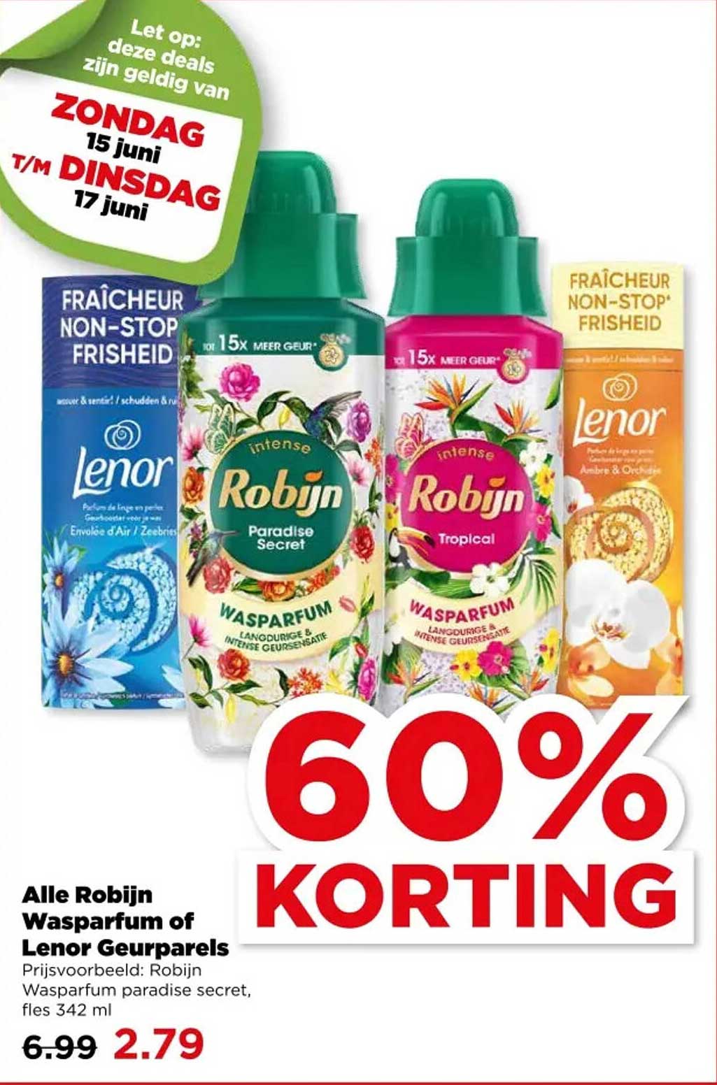 Bekijk nu de Alle Robijn Wasparfum of Lenor Geurparels aanbieding in de PLUS folder. Deze aanbieding is geldig van 15-06-2025 tot en met 17-06-2025.