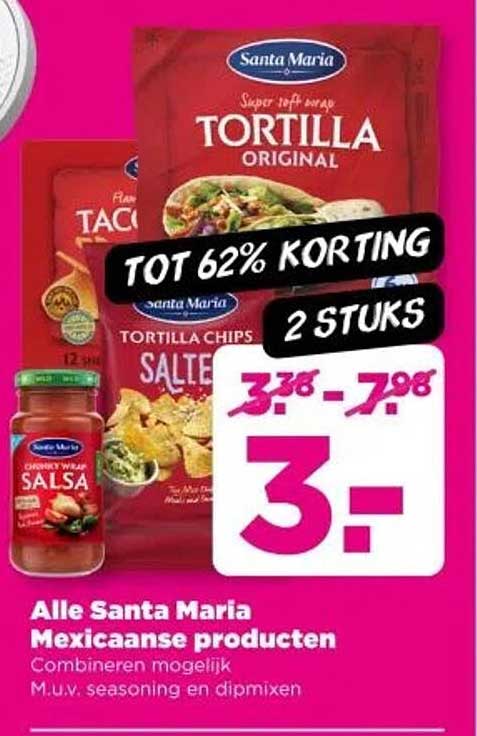 Bekijk de Alle Santa Maria Mexicaanse Producten aanbieding bij PLUS! Deze fantastische aanbieding is nu beschikbaar in de nieuwste PLUS folder. Profiteer van deze kans en bespaar flink op je aankoop.