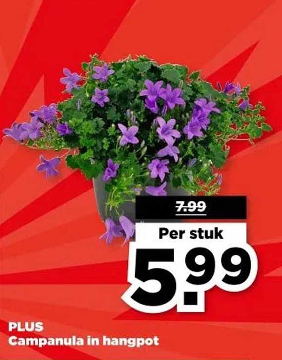 Bekijk nu de Campanula in hangpot aanbieding in de PLUS folder. Deze aanbieding is geldig van 02-04-2025 tot en met 08-04-2025.