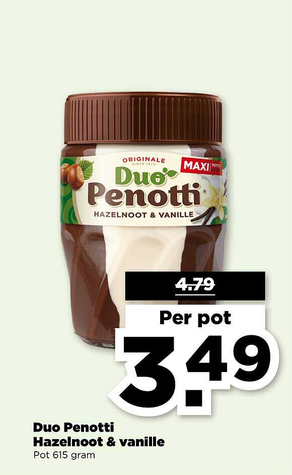 Bekijk de Duo Penotti Hazelnoot & Vanille aanbieding bij PLUS! Deze fantastische aanbieding is nu beschikbaar in de nieuwste PLUS folder. Profiteer van deze kans en bespaar flink op je aankoop.