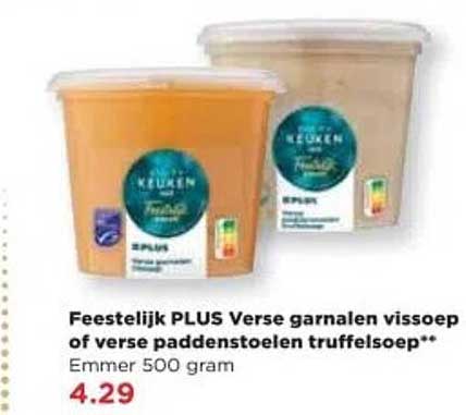 Feestelijk Plus Verse Garnalen Vissoep Of Verse Paddenstoelen Truffelsoep aanbieding bij PLUS
