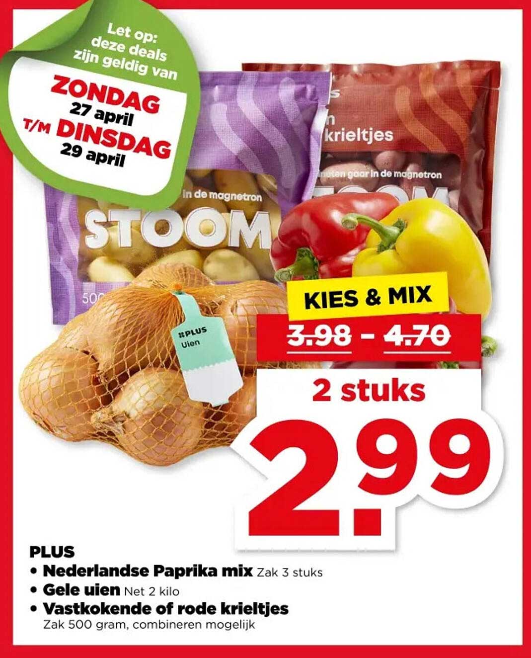 Heb je behoefte aan verse ingrediënten voor je maaltijden? Kijk dan niet verder! Op deze pagina vind je een heerlijke aanbieding van PLUS: Kies 2 stuks uit een selectie van verse groenten en aardappelen voor slechts €2,99. Dit is de perfecte gelegenheid om eens flink te variëren in je gerechten en tegelijkertijd te besparen!