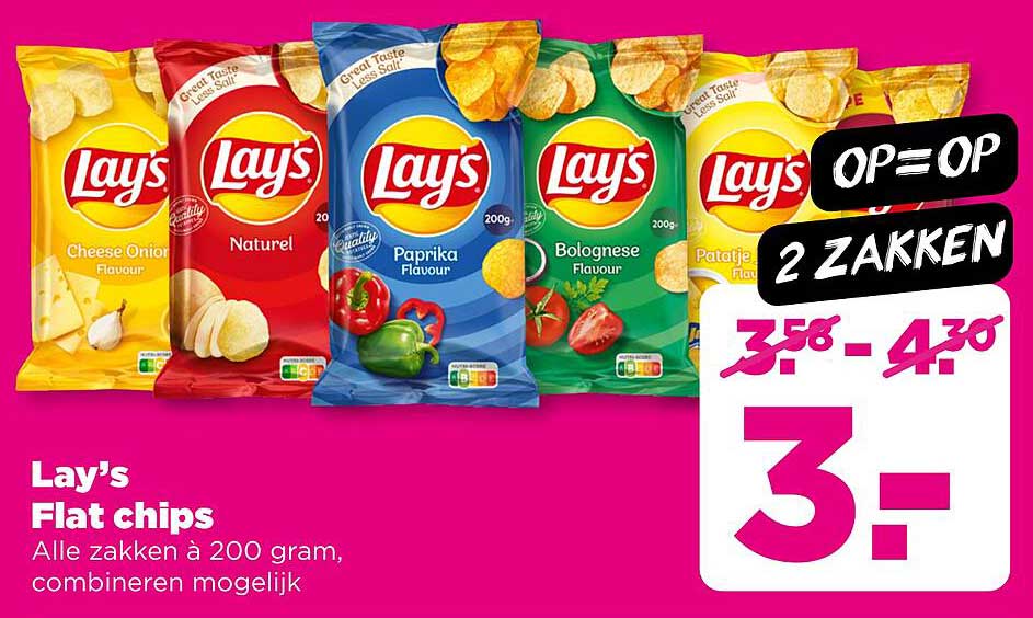 Bekijk de Lay's Flat Chips aanbieding bij PLUS! Deze fantastische aanbieding is nu beschikbaar in de nieuwste PLUS folder. Profiteer van deze kans en bespaar flink op je aankoop.