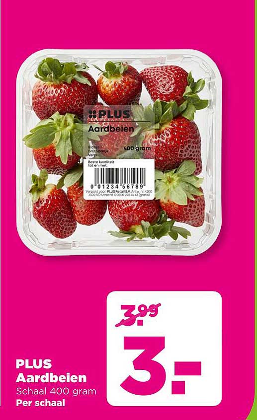 Bekijk de Plus Aardbeien aanbieding bij PLUS! Deze fantastische aanbieding is nu beschikbaar in de nieuwste PLUS folder. Profiteer van deze kans en bespaar flink op je aankoop.