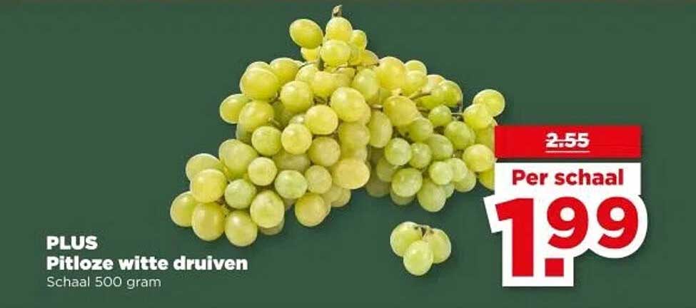 Normaal gesproken betaal je €2,55 voor een schaal pitloze witte druiven, maar deze week profiteer je van een speciale aanbieding van slechts €1,99! Dat is een significante besparing en een geweldige kans om je voorraad aan te vullen met deze gezonde lekkernij. Mis het niet!