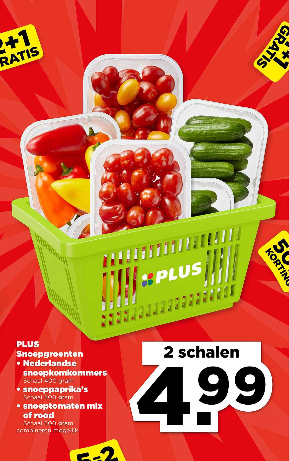 Bekijk nu de PLUS Snoepgroenten Nederlandse snoepkomkommers, snoeppaprika's en snoptomaten mix of rood aanbieding in de PLUS folder. Deze aanbieding is geldig van 26-03-2025 tot en met 01-04-2025.