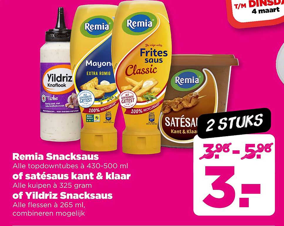 Bekijk nu de Remia Snacksaus aanbieding in de PLUS folder. Deze aanbieding is geldig van 26-02-2025 tot en met 04-03-2025.