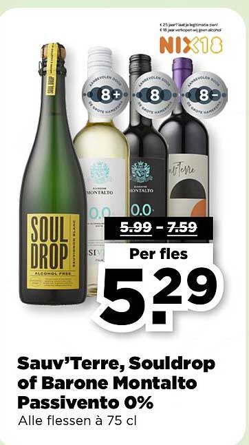 Bekijk nu de Sauvg’Terre, Souldrop of Barone Montalto Passivento 0% aanbieding in de PLUS folder. Deze aanbieding is geldig van 16-04-2025 tot en met 22-04-2025.