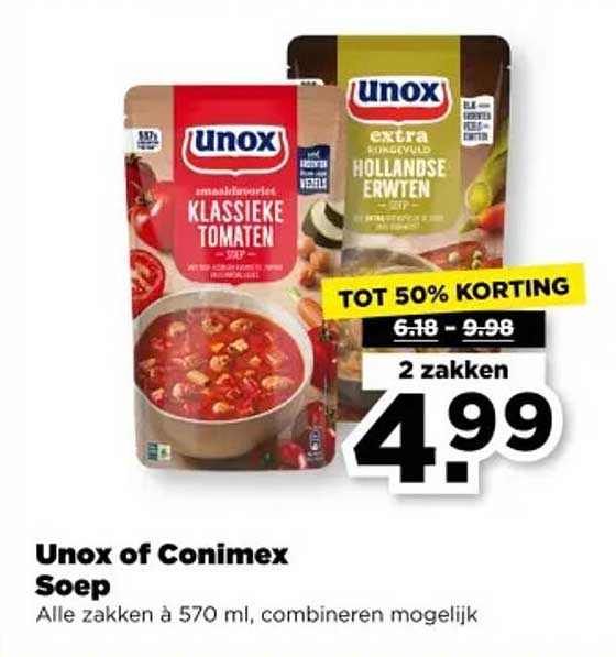 Bekijk de Unox Of Conimex Soep aanbieding bij PLUS! Deze fantastische aanbieding is nu beschikbaar in de nieuwste PLUS folder. Profiteer van deze kans en bespaar flink op je aankoop.