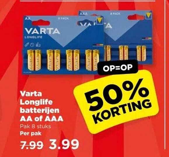 Ben je op zoek naar betrouwbare en duurzame batterijen? Dan is dit jouw kans! Op deze pagina ontdek je een geweldige aanbieding voor Varta Longlife batterijen, beschikbaar in AA of AAA, in een handige verpakking van 8 stuks. Met 50% korting van slechts €3.99, is dit het perfecte moment om in te slaan!