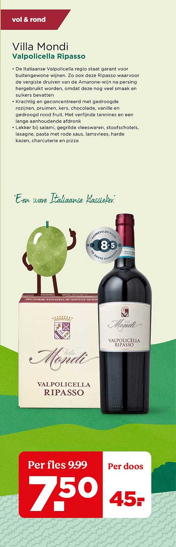 Bekijk nu de Villa Mondi Valpolicella Ripasso aanbieding in de PLUS folder. Deze aanbieding is geldig van 26-03-2025 tot en met 01-04-2025.