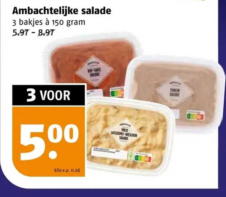 Normaal gesproken betaal je tussen de €5,97 en €8,97 voor deze heerlijke salades. Maar deze week is er een speciale actie: je krijgt 3 bakjes voor slechts €5,00! Dit is een flinke besparing en een geweldige kans om verschillende smaken te proberen. Mis deze deal niet en vul je koelkast met deze lekkere salades!