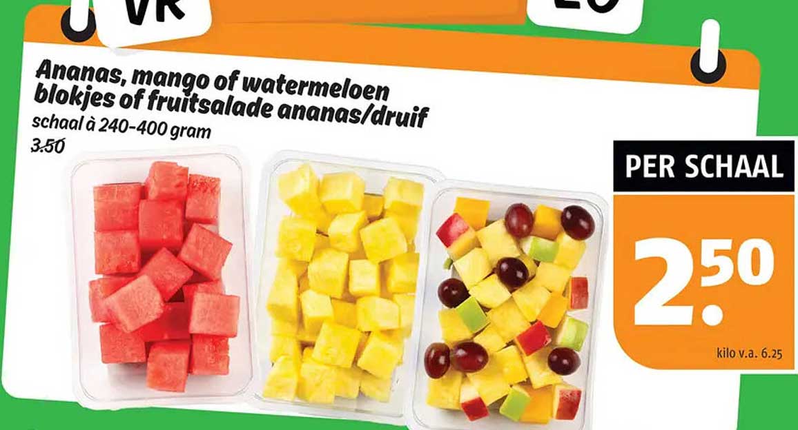 Ben je op zoek naar een lekkere en gezonde snack? Dan zit je goed met onze super aanbiedingen voor ananas, mango of watermeloen blokjes, of probeer de verrukkelijke fruitsalade met ananas en druif. In de warme dagen zijn deze fruitopties perfect om jezelf te verfrissen. De aanbieding loopt van 21 augustus tot en met 23 augustus, dus zorg dat je het niet mist!