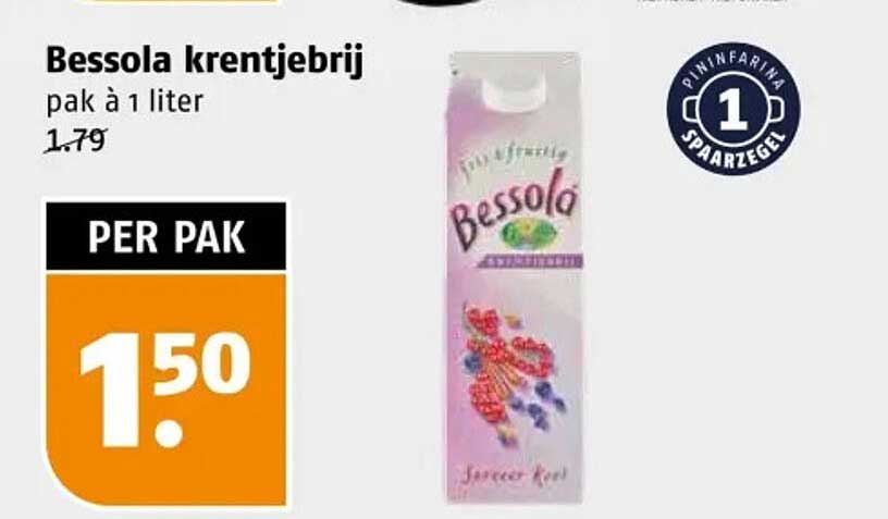 Bekijk nu de Bessola krentjebrij pak à 1 liter aanbieding in de Poiesz folder. Deze aanbieding is geldig van 12-10-2025 tot en met 18-10-2025.