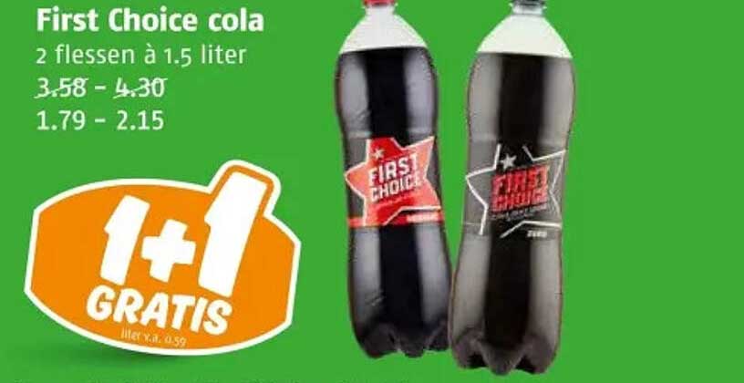First Choice cola is een favoriet onder velen. Of je nu een filmavond organiseert of gewoon lekker wilt genieten van een frisse cola, deze drank biedt de perfecte combinatie van zoetheid en bruis. Bovendien, met de '1 + 1 gratis' aanbieding is het nu nóg aantrekkelijker om te kopen. Wat is er beter dan samen met vrienden van een verfrissend drankje te genieten?