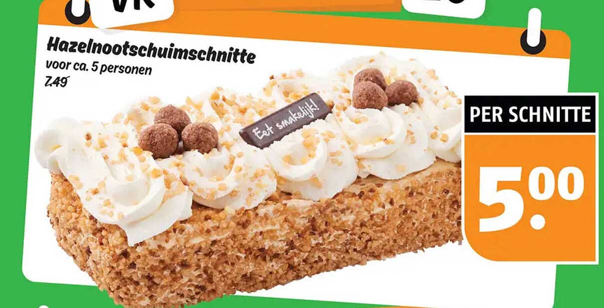 De huidige prijs voor de hazelnootschuimschnitte is slechts €5,00 per schnitte. Dit is een geweldig aanbod wanneer je bedenkt dat een traditionele taarten of gebakjes vaak veel duurder zijn. Geniet van deze heerlijke traktatie zonder je zorgen te maken over je budget. Dat is echt een voordeel!