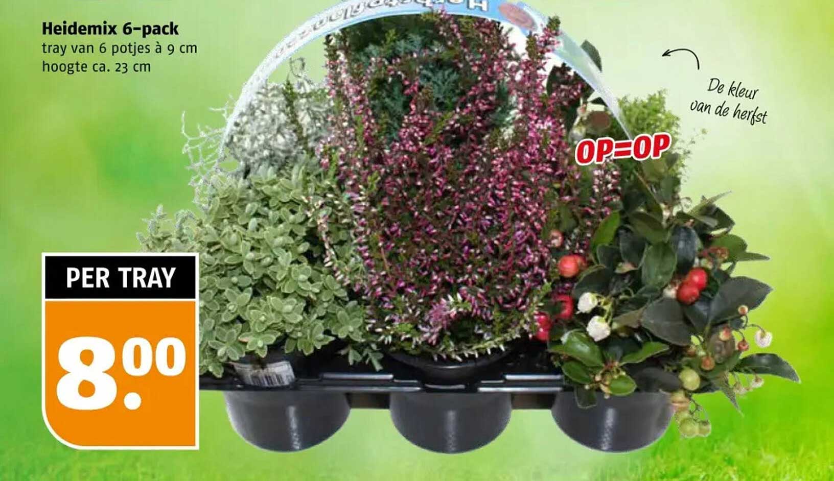 Zaai de kleuren van de herfst in je tuin met de Heidemix 6-pack! Deze aanbieding is perfect voor tuinliefhebbers die hun buitenruimte willen verfraaien. Van 14 september tot en met 20 september 2025 kun je genieten van deze fantastische deal terwijl de bladeren beginnen te vallen en de natuur ons verwent met zijn mooiste kleuren.