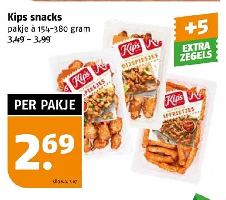 Normaal gesproken betaal je tussen de €3,49 en €3,99 voor een pakje. Maar nu kun je ze scoren voor slechts €2,69! Een fantastische korting die je niet wilt missen. Dit is dé kans om je voorraad Kips snacks aan te vullen en ongegeneerd te genieten van deze smakelijke traktaties.